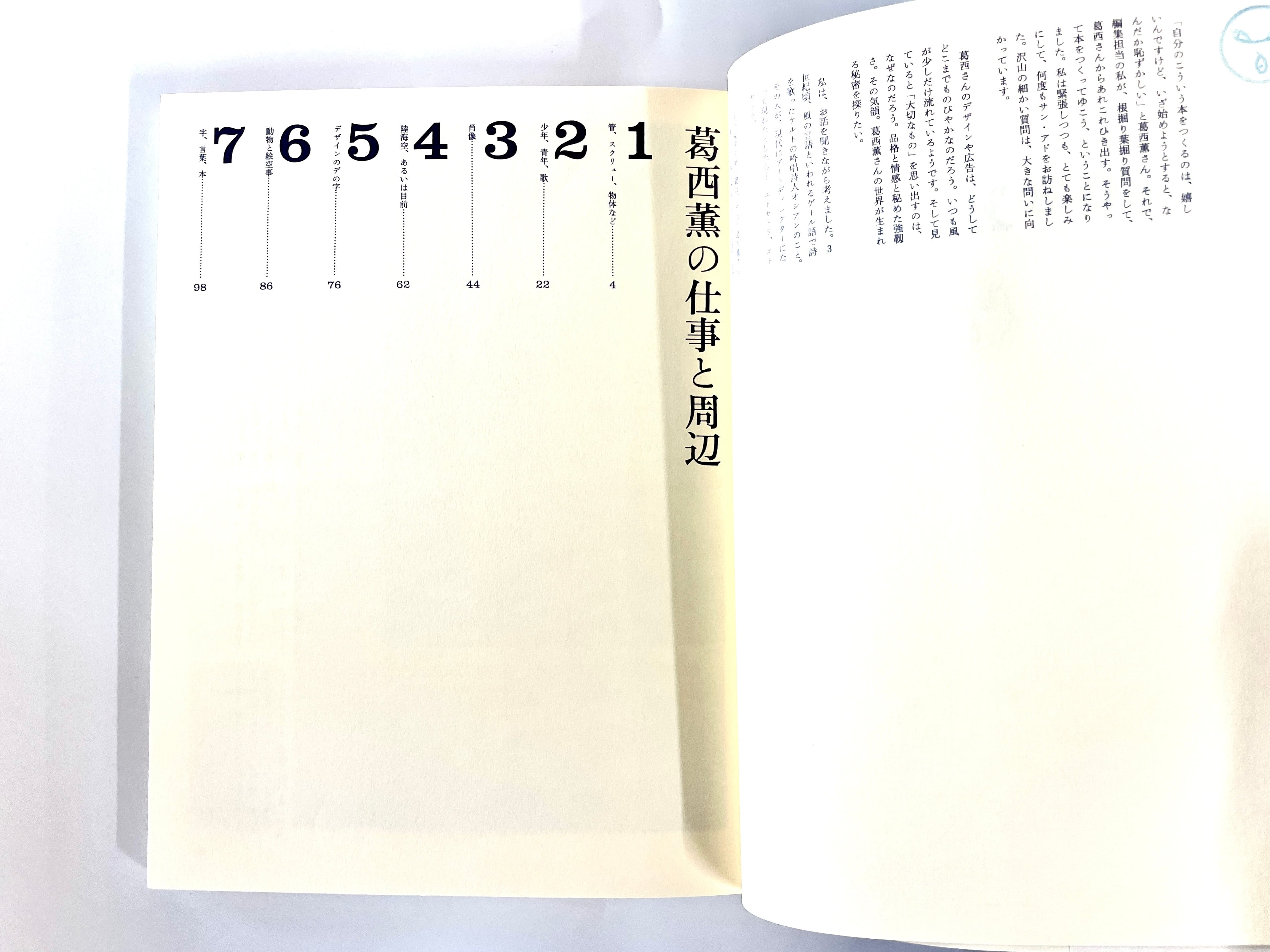 日本を代表するアートディレクター、葛西薫の仕事をまとめた作品集。「管、スクリュー、物体など」「少年、青年、歌」「デザインのデの字」などテーマ別に7章で構成。そのテーマに沿った絵コンテやスケッチなどの資料を含め、「サントリー烏龍茶」「西武百貨店」などの広告、ブックデザインや個展など、さまざまなアートワークを掲載する。